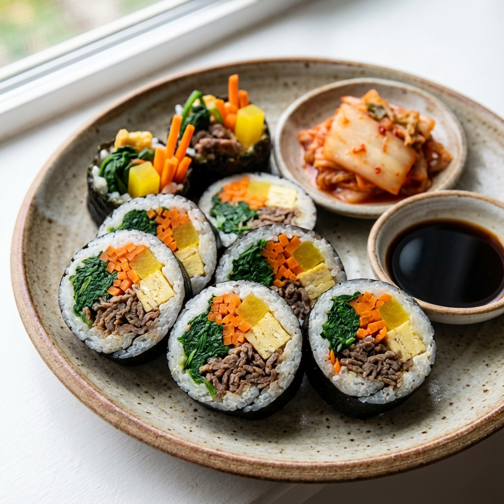 ごま油が香る韓国風海苔巻き。手軽に食べられるので、朝食やピクニックのお供に最適です。
