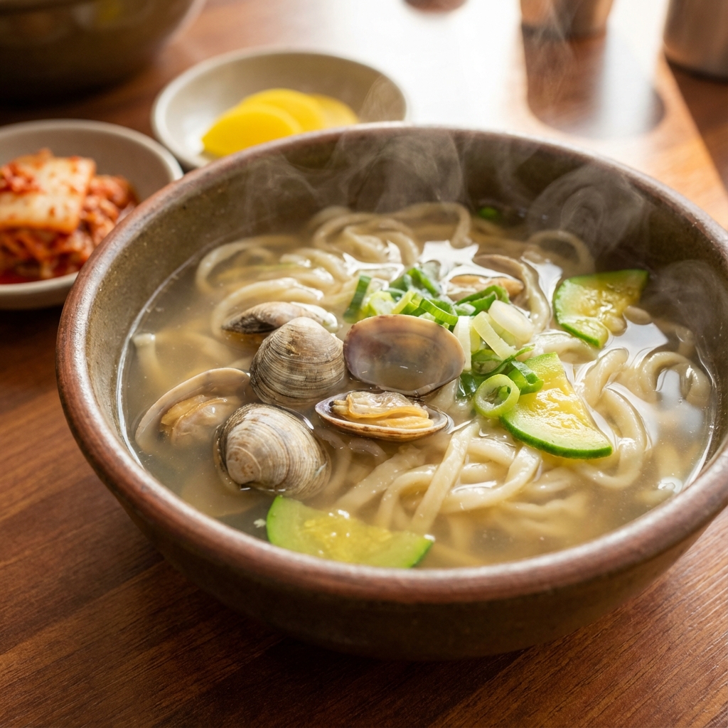 包丁で切って作る韓国風うどん。アサリや鶏の出汁が効いた優しいスープが体に染み渡ります。