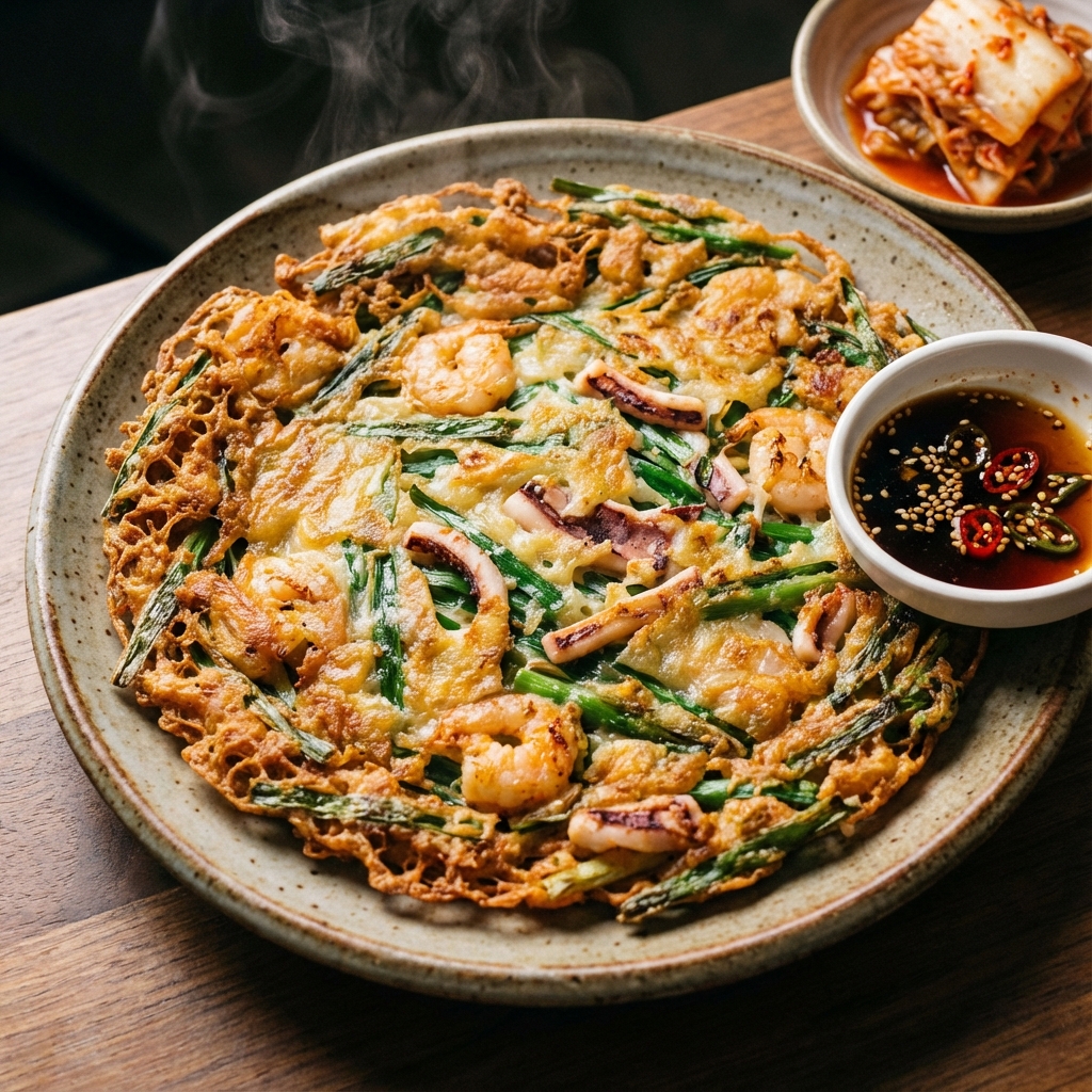 外はカリッ、中はモチッとした韓国風お好み焼き。雨の日にはマッコリと一緒に食べるのが韓国流。