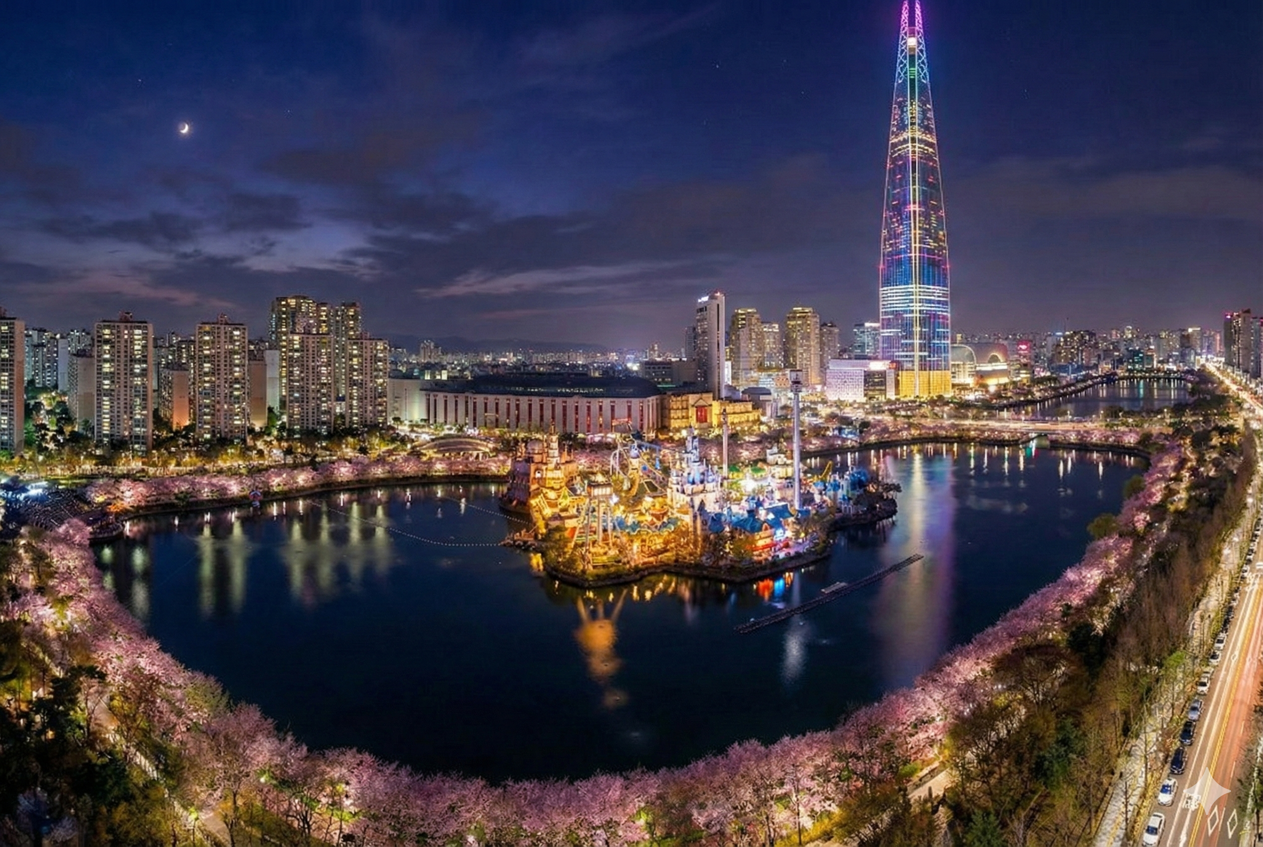説明: 湖の散策路とタワーの照明が調和し、夜の散歩に最適です。住所: ソウル特別市松坡区蚕室洞 (石村湖一帯)