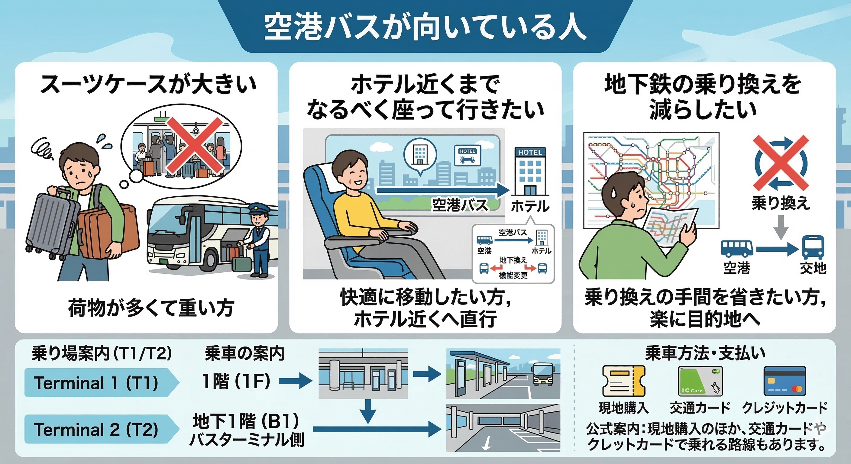 空港バスは、Terminal 1は1階、Terminal 2は地下1階のバスターミナル側を基準に動く案内が多いです。公式案内では、現地購入のほか、交通カードやクレジットカードで乗れる路線もあります。