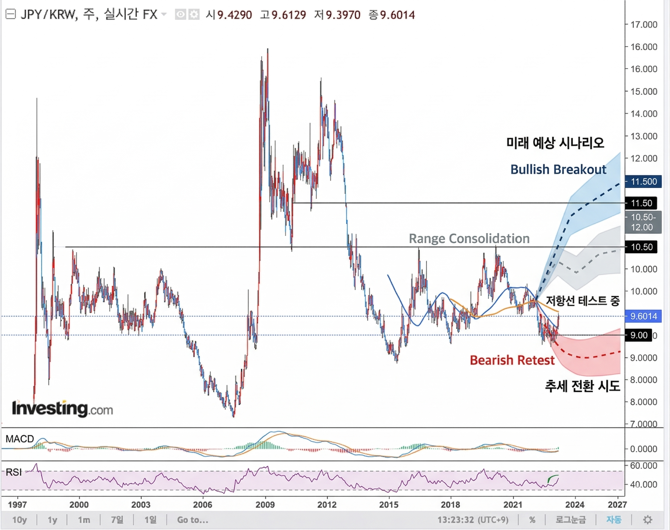チャート全体を見ると、円ウォン相場は大きく見ればレンジの中で動いてきたことが読み取れます。その中で今は9.0ウォン台の下値圏から持ち直し、10.5ウォン前後の節目を意識する位置まで戻してきた流れです。もしこのラインを明確に上抜けるなら、次は11.5ウォン前後まで意識されやすくなります。反対にここで押し返されるなら、もう一度下方向を試す可能性も残ります。