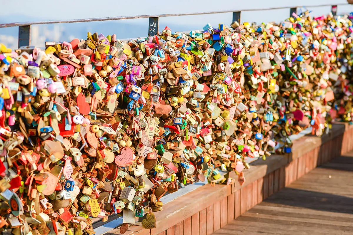 Nソウルタワーの名物である「愛の南京錠」はテレビ番組や韓国ドラマにもよく登場し、恋人たちが永遠の愛を誓いながら鍵をかける『恋のパワースポット』として有名です。南京錠はテラスにある自販機で購入(10,000ウォン~)し、二人の名前や恋愛に関するメッセージを書き込んでから、キーツリーやフェンスに南京錠を掛けることで永遠の愛を誓います。