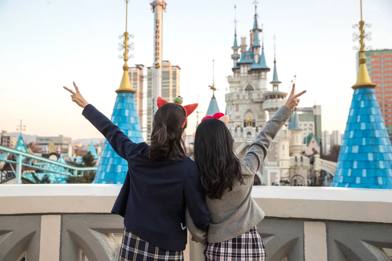 高校の制服をレンタルしてロッテワールドに行くのが、韓国の若者やカップルの間で定番の楽しみ方となっています。制服はロッテワールド周辺のレンタルショップで借りることができ、そこにカチューシャをプラスしたらコーデが完成♡