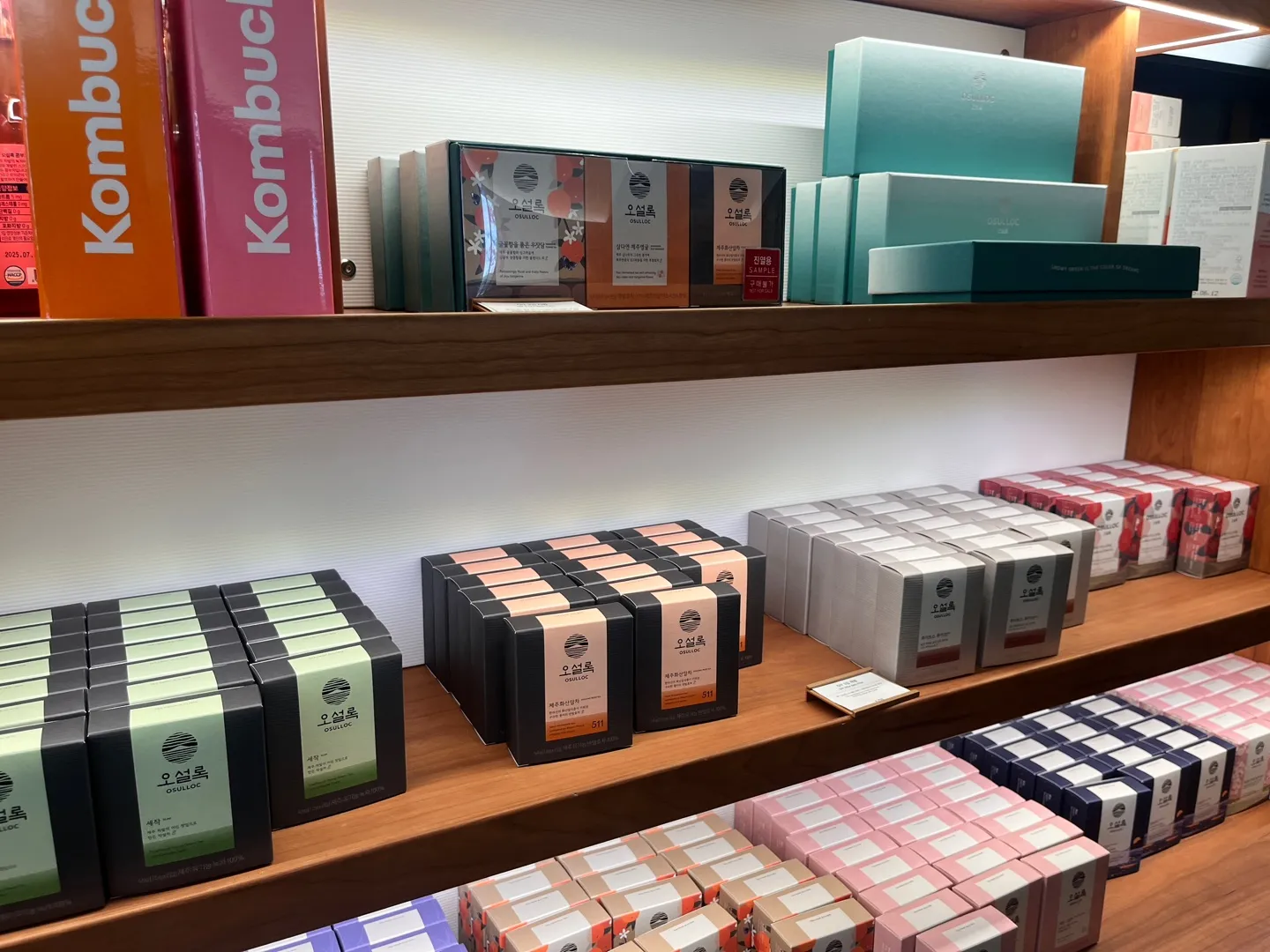 博物館内のお土産ショップでは、済州島産の緑茶を使用したお茶やスキンケア商品、お菓子など、ここでしか手に入らない限定アイテムが豊富に揃っています。さらに試飲コーナーも設置されており、実際に味を確かめてから購入できるのも嬉しいポイント ! オソルロックのお茶はソウルのデパ地下などでよく見かけるブランドですが、その茶葉はすべて済州島で栽培されたもの。そのため、本場・済州島ではより充実したラインナップが揃っており、パッケージも色鮮やかなデザイで贈り物にもぴったりです◎