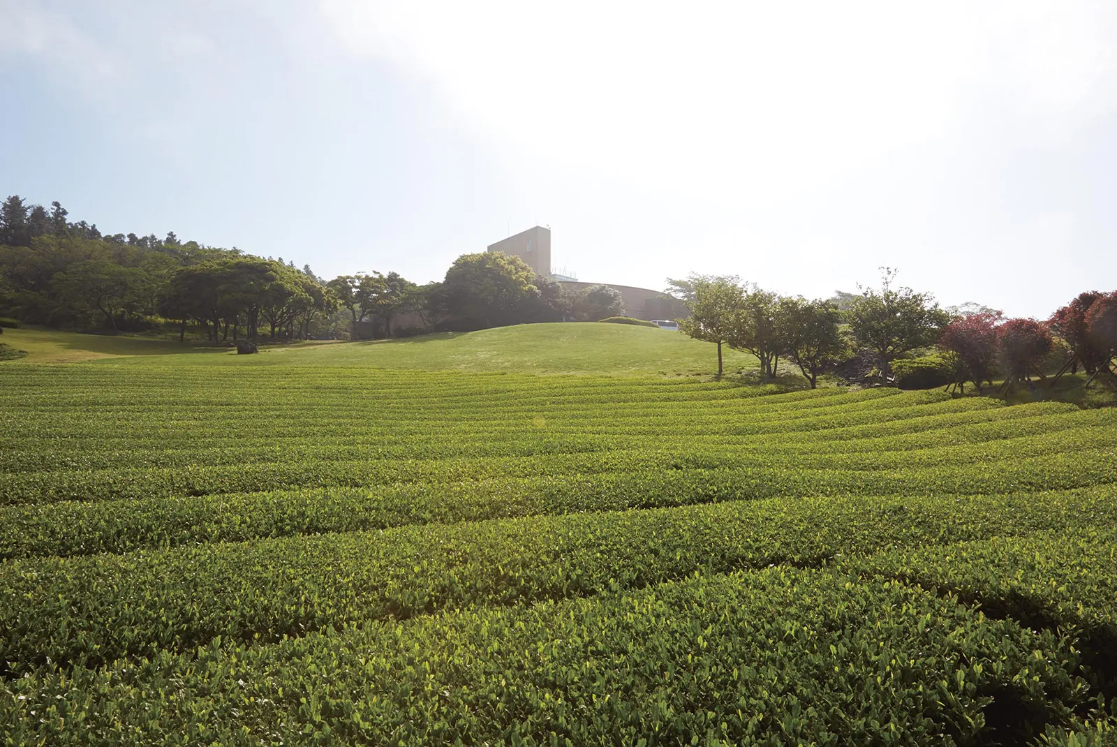 博物館の目の前には、80万平方メートルに及ぶ広大な茶畑が広がり、自由に散策や写真撮影を楽しむことができます。さらに、館内には屋上展望台も設置されており、室内からでも茶畑の美しい景色を一望できちゃう ! そもそも済州島は韓国でも数少ないお茶の産地のひとつ。火山島特有のミネラル豊富な土壌には有機物がたっぷりと含まれており、これが良質なお茶を生み出す理由とされています。